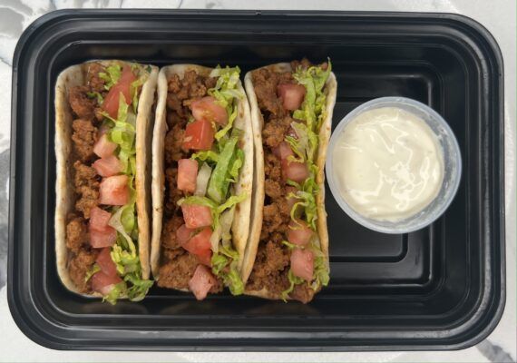 Ground turkey perfectly seasoned with our classic taco seasoning blend. Served on three (3) street tacos with shredded lettuce, tomatoes and low-fat sour cream.